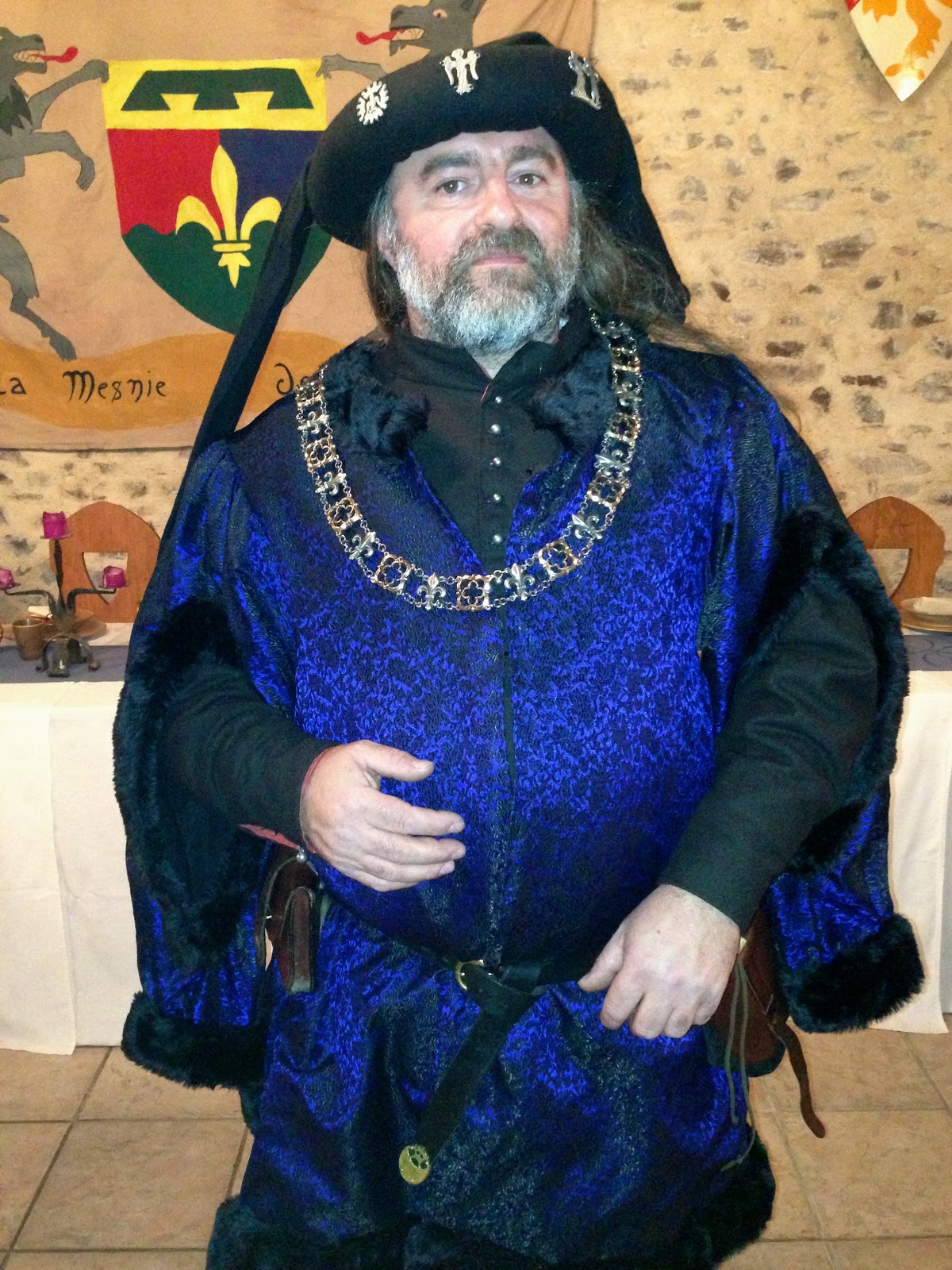 Comme il faut adapter le manteau à la période, à l'âge et à la morphologie, j'ai modifié la longueur. Fréquemment, les hommes de l'âge de Joli Papa, hommes d'âge mûr représentant la sagesse, sont figurés avec un manteau descendant jusqu'au cheville. Cependant, sa très honorable stature et son inestimable gourmandise (aucune critique, je suis gourmande aussi) ne souffrent pas un manteau trop long. Question d'élégance et de principe. Comme aucune miniature de ma connaissance ne représente de Mr Gourmand (ni de Mme Gourmande d'ailleurs), j'ai donc choisi la longueur standard 1430, aux environs du genoux. un jour peut-être, dans quelques centaines d'années, quand j'aurais pu étudier toutes les miniatures, je reviendrais sur cette position.
